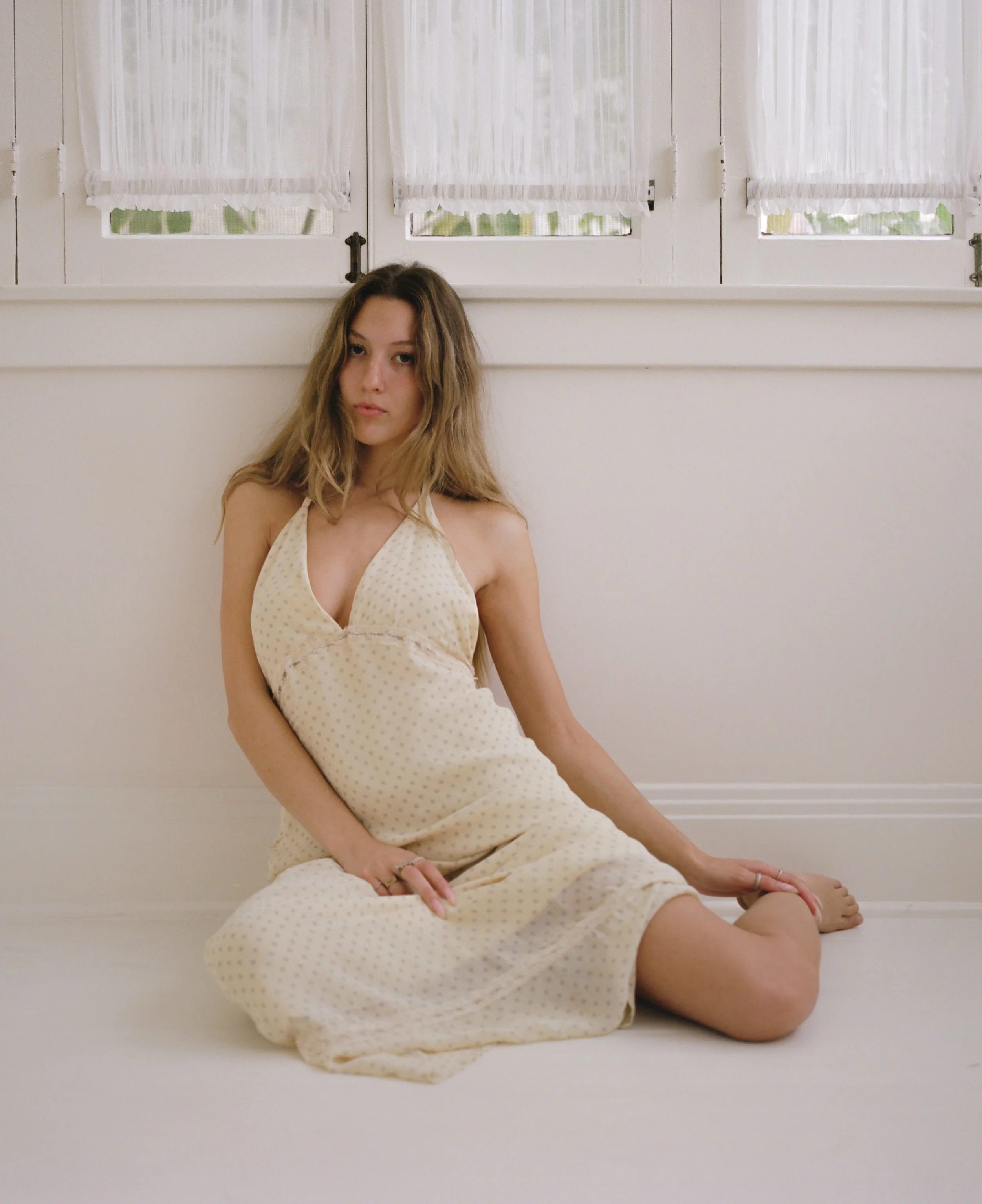 Made with deadstock yellow polka dots and vintage lace trim, the Iris Dress is a piece to treasure for years. Elastic waistline ensures the perfect fit.